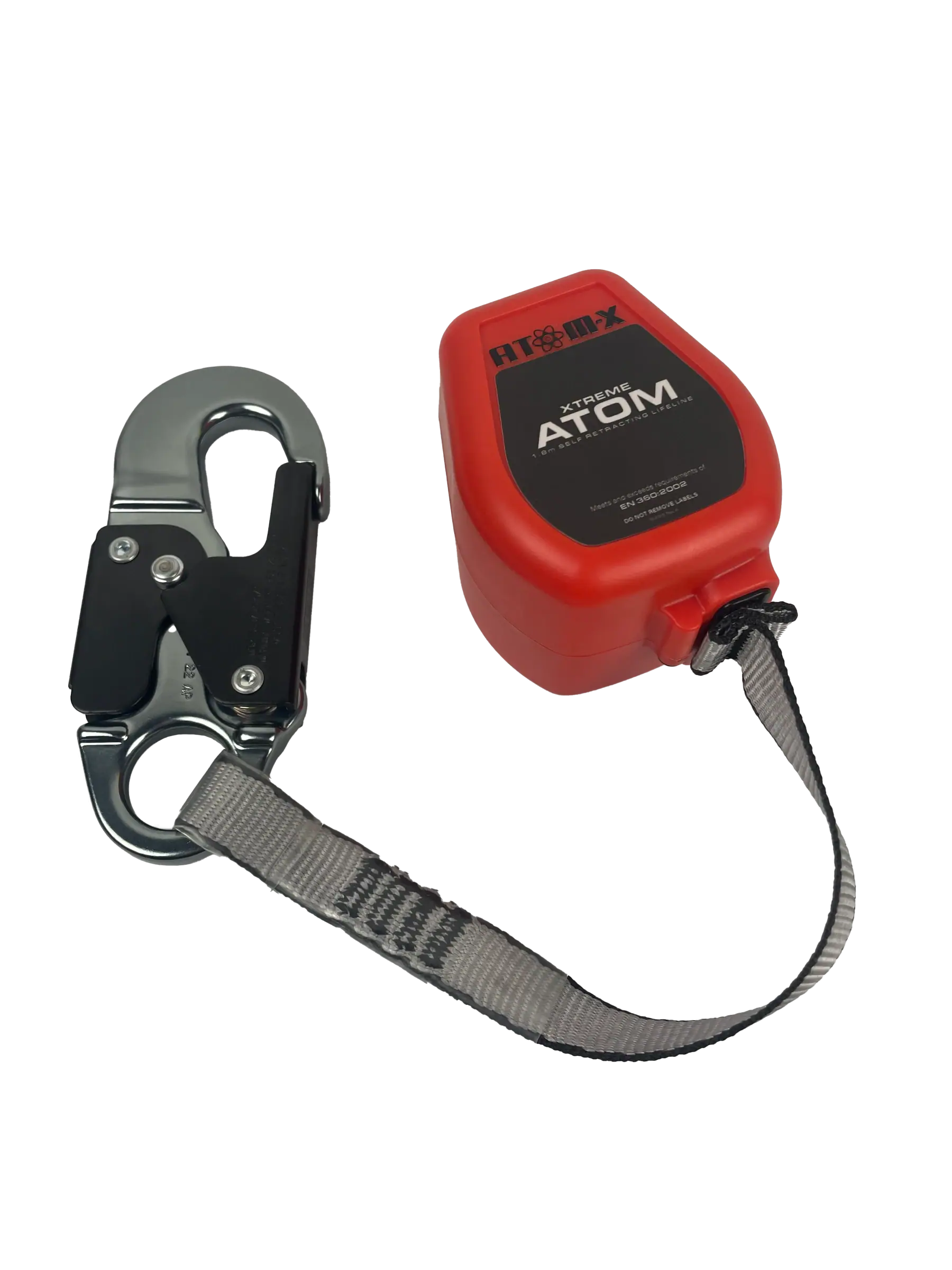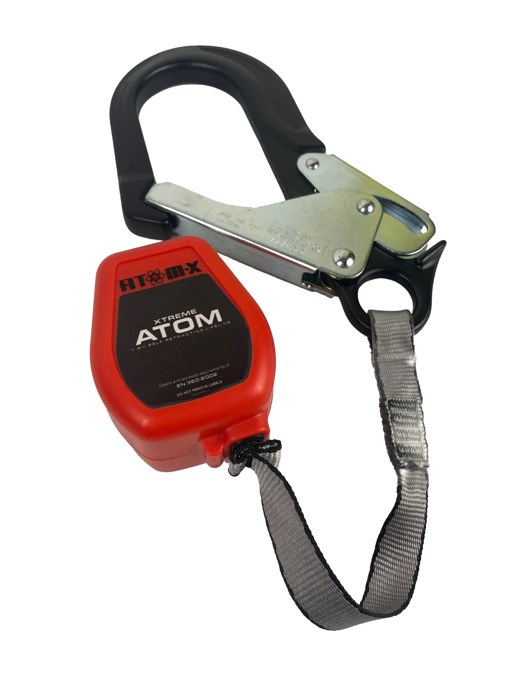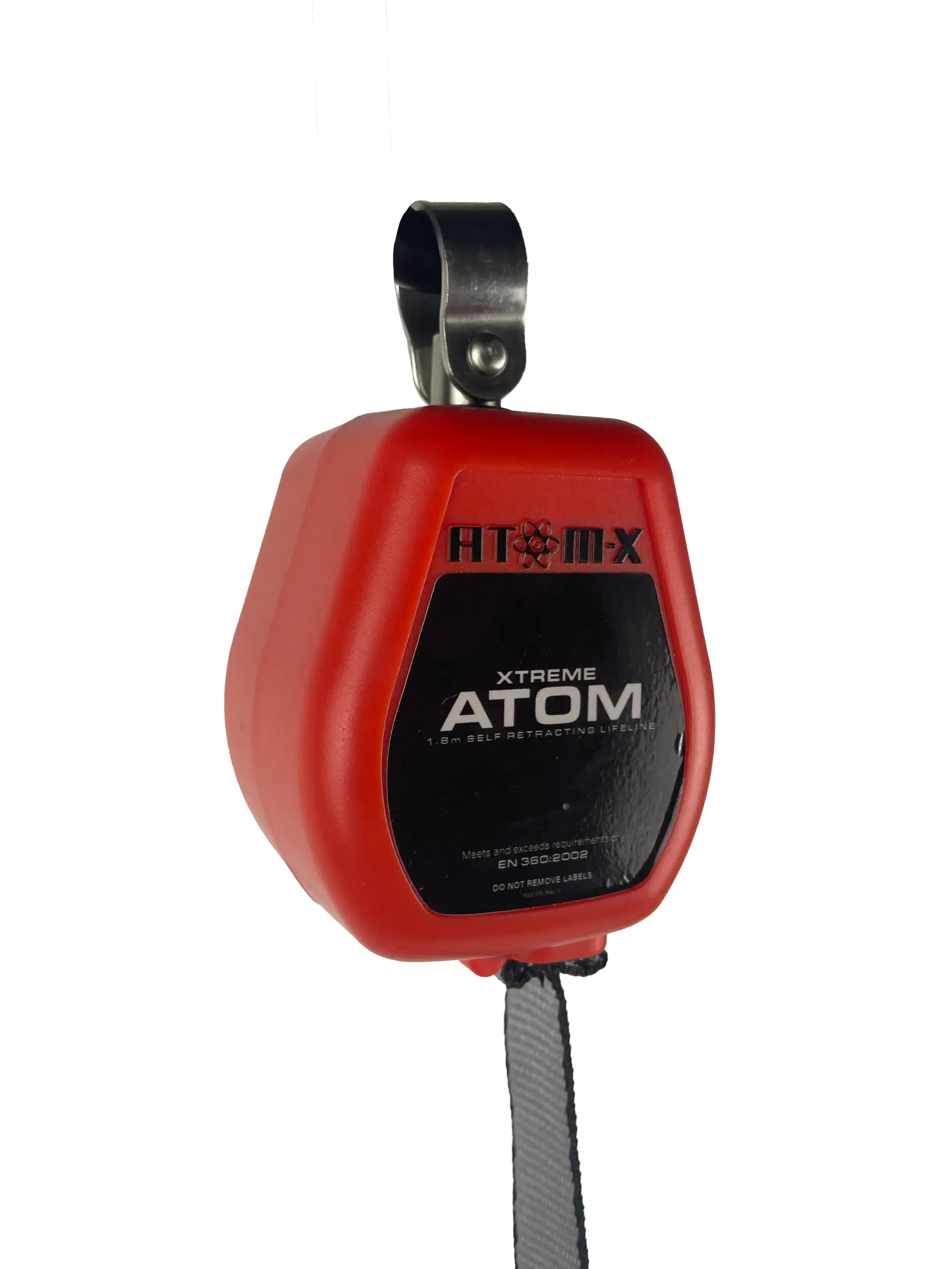 Checkmate ATOM-XTREME lightweight retractable type fall arrest. ATOM-XTREME is the smallest and lightest retractable type fall arrest in its class in the world. Its lightweight chassis, PC ABS housing and webbing made with Dyneema® contribute to its outstanding strength and performance. The ATOM XTREME range is a totally new concept in design engineering and has a revolutionary triple micro pawls lockout system and a full internal braking mechanism. All models can be linked together with a dual kit.