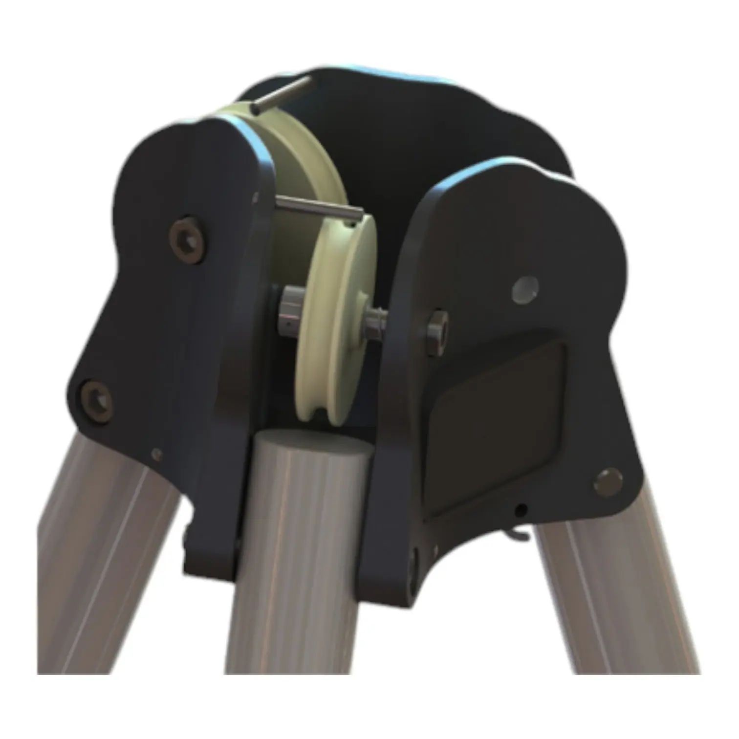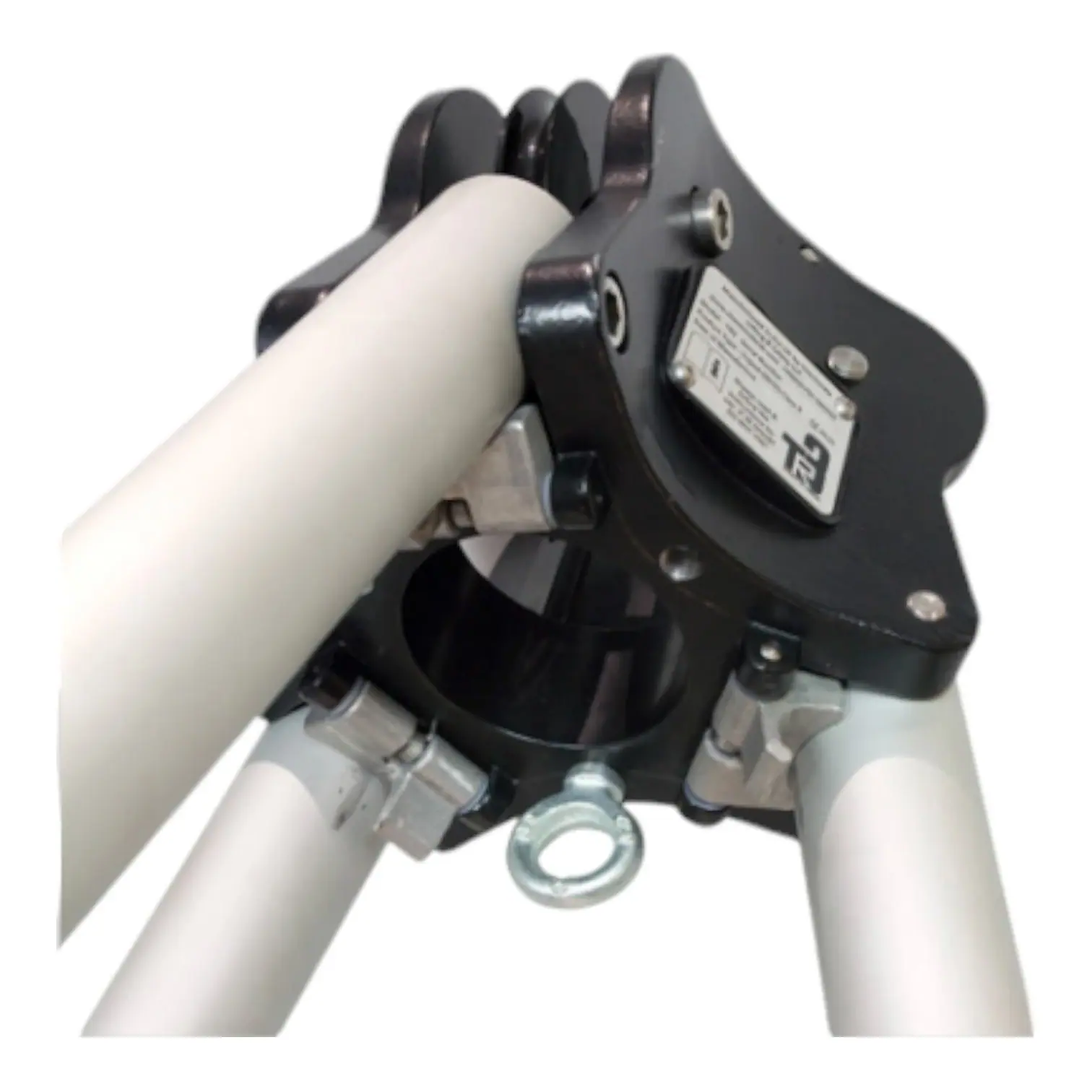 Tripod fitted with pivoting feet with hot bonded rubber soles for soft or hard surfaces. Includes slot for anti-splay webbing strap.